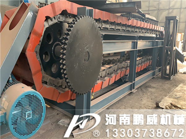 鏈板機結構設計合理,使用性能好,運行阻力小,易損零件少,操作安全,維修方便,運行可靠,使用壽命長。鏈板機可水平或傾角<30°安裝,傾斜安裝時,配有棘輪逆止機構。輸送鏈板上的輥輪在導軌上滾動,輸送鏈與機殼無磨擦;鏈條采用合金鋼熱處理加工制成,其正常使用壽命3年左右,運行中故障率低。除頭尾軸承外,輸送機中無潤滑點。鏈板機由頭部機架、頭部護罩、主動鏈輪組、輸料裝置、中部機架、尾部機架、改向鏈輪組,鏈板托輪組和驅動裝置組成。驅動裝置由柱銷聯軸器、JZQ減速機、驅動底座組成。分右裝和左裝兩種,從機尾向輸送方向看,驅動裝置在右側為右裝,在左側為左裝。鏈輪采用組裝式結構,由鑄鋼鏈輪圈與鏈輪芯用螺栓聯結組合,耐磨性能強,便于拆卸安裝。主動鏈輪采用窩眼鏈輪圈,防止環(huán)鏈運行中滑動。